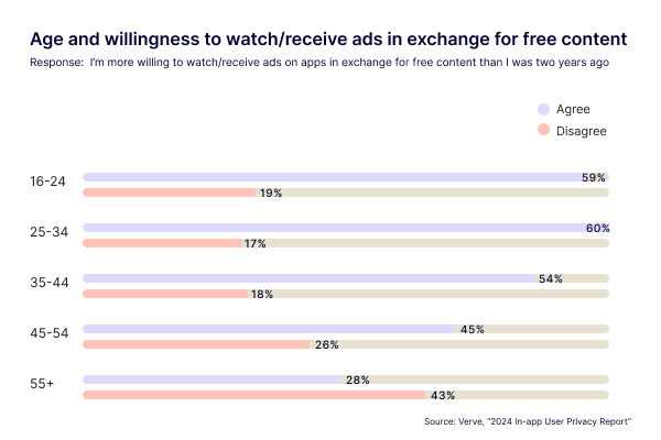 Of those that gave an opinion, 67% of consumers agreed they are more willing to watch or receive ads on apps in exchange for free content than two years ago, and 69% stated that if advertising is more targeted and interesting, they would be less likely to pay to remove them.